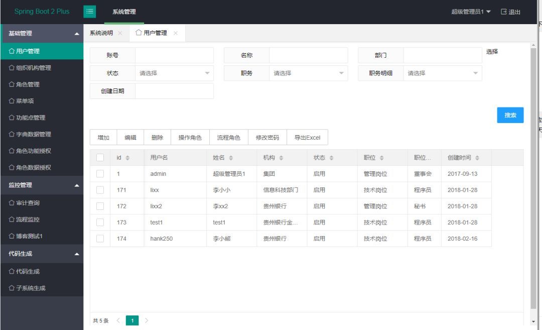 一个基于SpringBoot 2 的管理后台系统,包含了用户管理,组织机构管理,角色管理,功能点管理,菜单管理,权限分配,数据权限分配,代码生成等功能 相比其他开源的后台系统,SpringBoot-Plus 具有一定的复杂度。系统基于Spring Boot2.1技术,前端采用了Layui2.4。数据库以MySQL/Oracle/Postgres/SQLServer为实例,理论上是跨数据库平台。